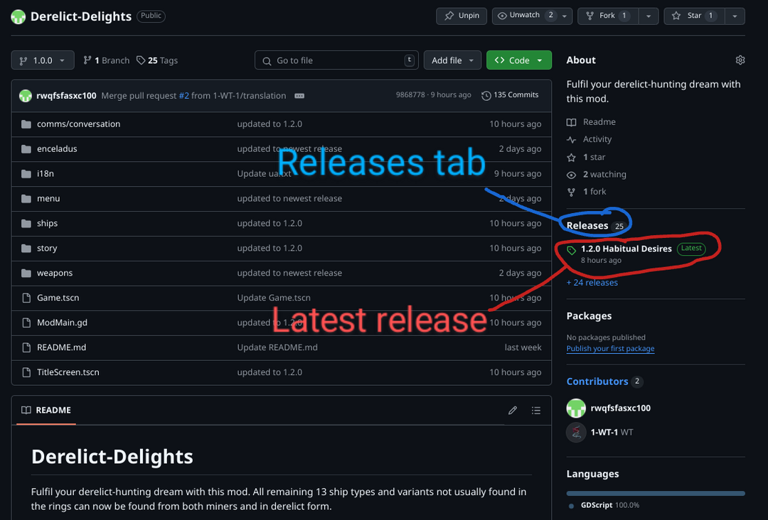 Some mods (such as for this example, K-Tech Industrial of Mars) have the pre-compiled zips stored within the repository itself. There are a few ways to download these. The first is to download the entire repository using either the download zip from the code button, or the download source button from the releases tab. From there, you can open the zip, go through the folders and extract the zip files you want.